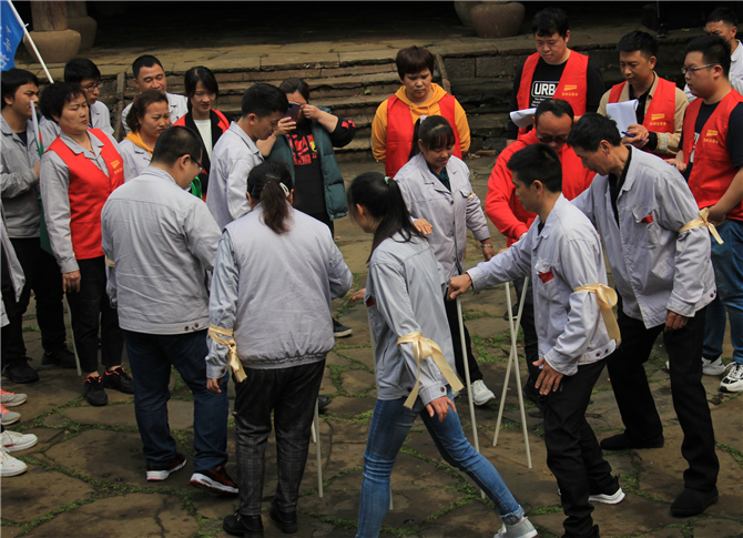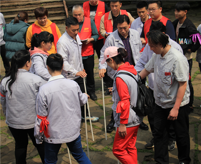 (not toppling the forest) the team members form a circle and hold the long pole perpendicular to the ground. The team members move and exchange positions in turn, and the long pole stands on the tree. After three rounds, the team takes the least time to win.
