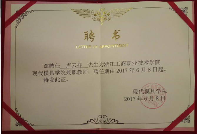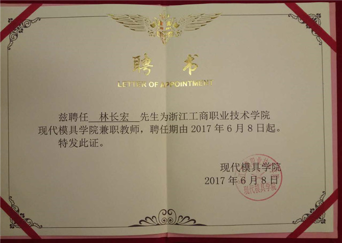 Huabao company since 2010, with industrial and commercial vocational technology college of zhejiang university-enterprise cooperation, warburg tooling department emerged a large number of qualified part-time teachers of senior cadres, they were industrial and commercial college employment as part-time teachers. On June 8, 2017, huabao shares four comrades were employed as a modern zhejiang ninghai branch of industry and commerce professional technology institute mould part-time teachers, they are respectively and Mr Lin, Lu Yunxiang, Lin Changhong, Wu Weican.