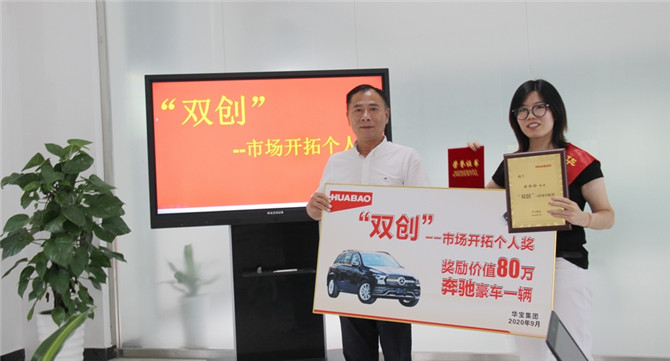 2020年9月29日,“雙創(chuàng)”--市場開拓個(gè)人獎(jiǎng)授車儀式在華寶集團(tuán)隆重舉行。分管外貿(mào)的俞玲玲女士以突出的銷售業(yè)績獲此殊榮,獎(jiǎng)勵(lì)價(jià)值80萬的奔馳豪車一輛。